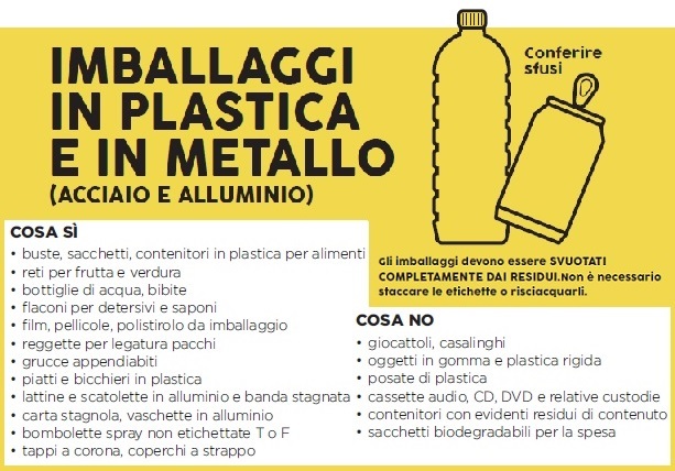 Dal 1° agosto 2019 i rifiuti in metallo (acciaio e alluminio) vanno conferiti insieme agli imballagi in plastica. Il conferimento prevede l’immissione diretta dei rifiuti all’interno di appositi contenitori, ovvero sacchi semitrasparenti in PE da circa 100 litri, forniti dal Consorzio. Tali sacchi dovranno essere posizionati all’esterno delle abitazioni, sulle pubbliche vie o strade ad uso pubblico ed anche private, ma soggette ad uso pubblico, a cura degli utenti, il giorno della raccolta o la sera precedente.