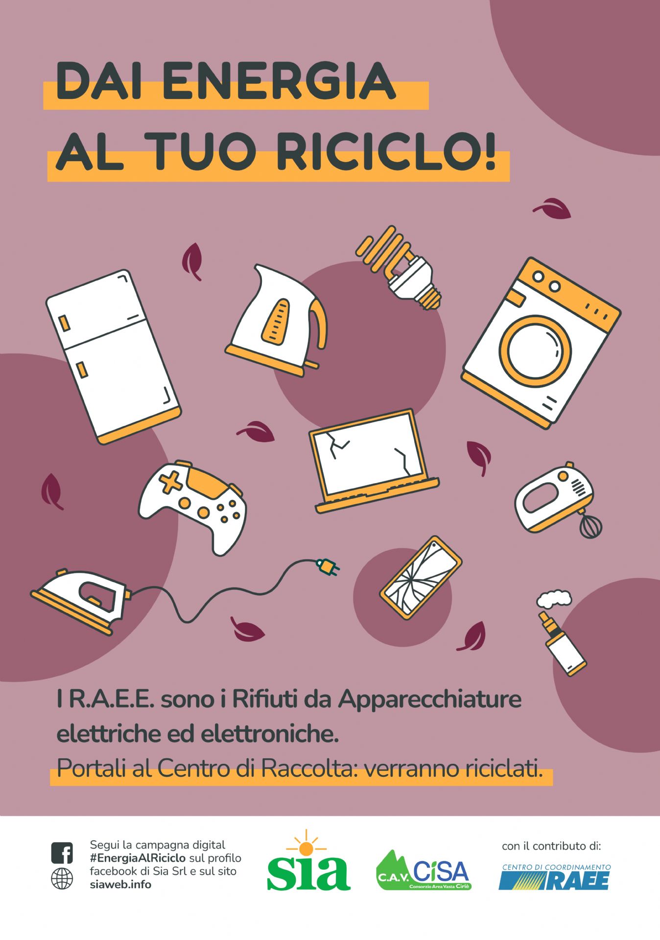 SIA Srl, in collaborazione con CAV CISA e con il sostegno finanziario del Centro di Coordinamento R.A.E.E., lancia una nuova campagna di sensibilizzazione intitolata "Dai Energia al tuo Riciclo". L'obiettivo principale è quello di informare e sensibilizzare i cittadini sulle tipologie di rifiuti che rientrano nella categoria R.A.E.E. (Rifiuti da Apparecchiature Elettriche ed Elettroniche) e sul loro corretto conferimento.