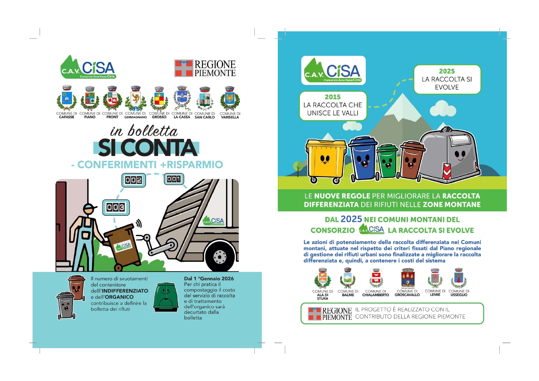 Per i Comuni di Pianura CAFASSE, FIANO, FRONT, GERMAGNANO, GROSSO, LA CASSA, SAN CARLO C.SE e VARISELLA e per i Comuni dell’ambito montano ALA DI STURA, BALME, CHIALAMBERTO, GROSCAVALLO, LEMIE, USSEGLIO e PESSINETTO, in attuazione di quanto previsto dal programma dei finanziamenti dei bandi regionali 2024/2025 – Linee di intervento L1 C MON ed L3 RID, si comunica che – a partire dal 2026 – il servizio di raccolta ingombranti a domicilio verrà effettuato con frequenza settimanale.